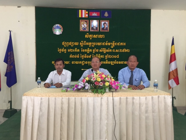 ថ្ងៃចន្ទ ១២កើត ខែកត្ដិក ឆ្នាំច សំរឹទ្ធិស័ក ព.ស.២៥៦២ ត្រូវនឹងថ្ងៃទី១៩ ខែវិច្ឆិកា ឆ្នាំ២០១៨ វគ្គសិក្ខាសាលាដែលរៀបចំឡើងដោយនាយកដ្ឋានបុគ្គលិក និងអភិវឌ្ឍន៍ធនធានមនុស្ស សហការជាមួយមន្ទីរកសិកម្ម រុក្ខាប្រមាញ់ និងនេសាទខេត្តកំពង់ធំ ក្រោមអធិបតីភាពលោក អ៊ុំ សាវី អនុប្រធាននាយកដ្ឋានបុគ្គលិក និងអភិវឌ្ឍន៍ធនធានមនុស្ស និងមានអ្នកចូលរួមសរុប ៥០នាក់ ស្រី ១៨នាក់ ។